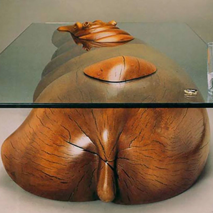 Mesas artesanales con animales que parecen emerger del agua